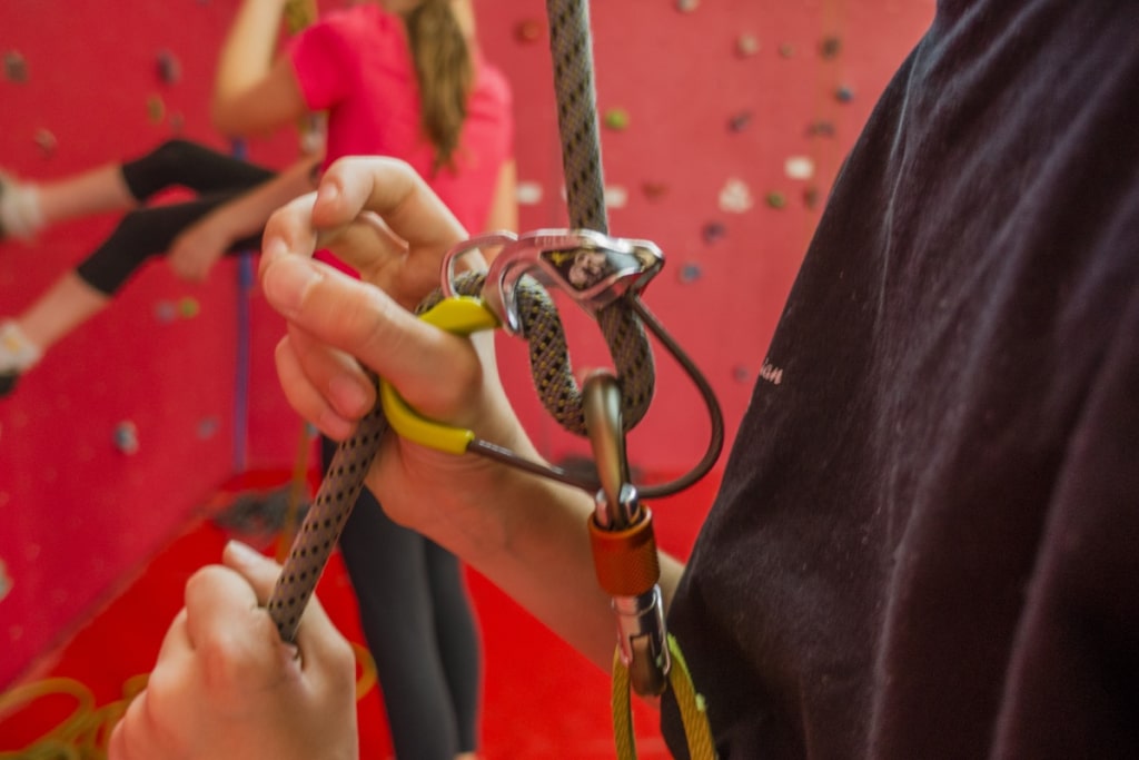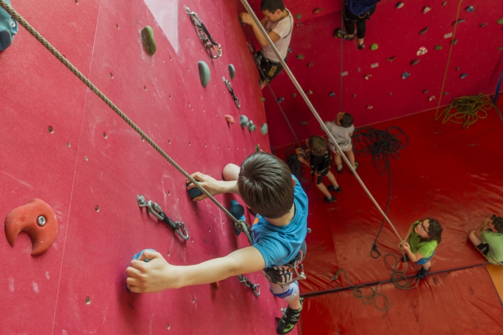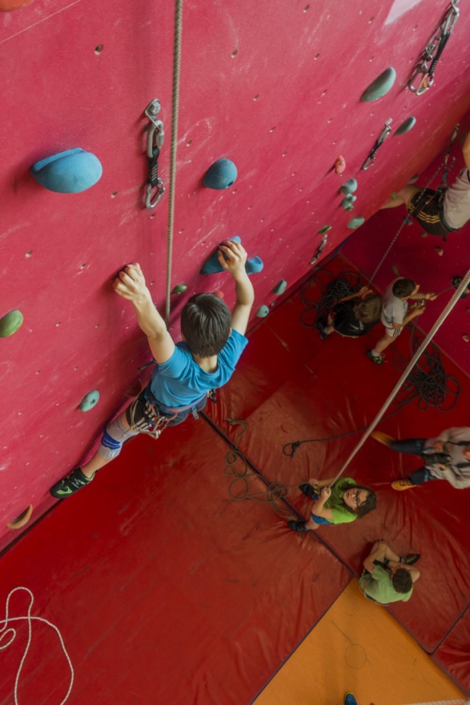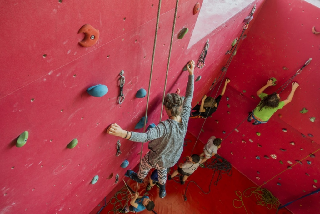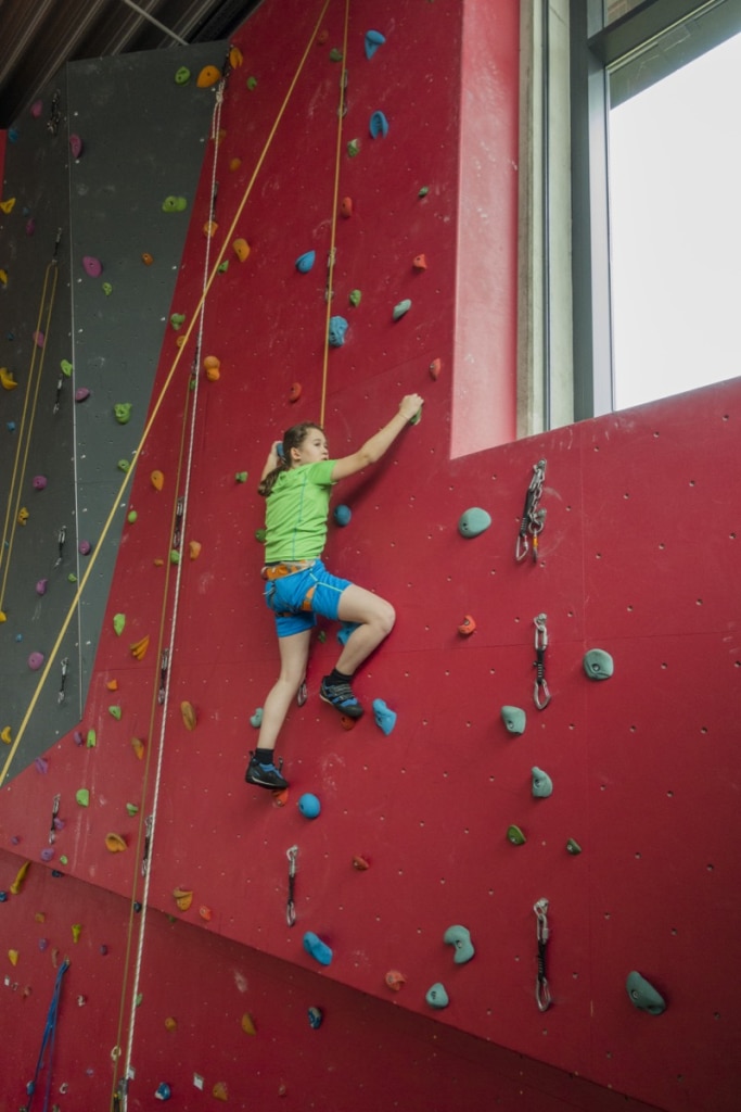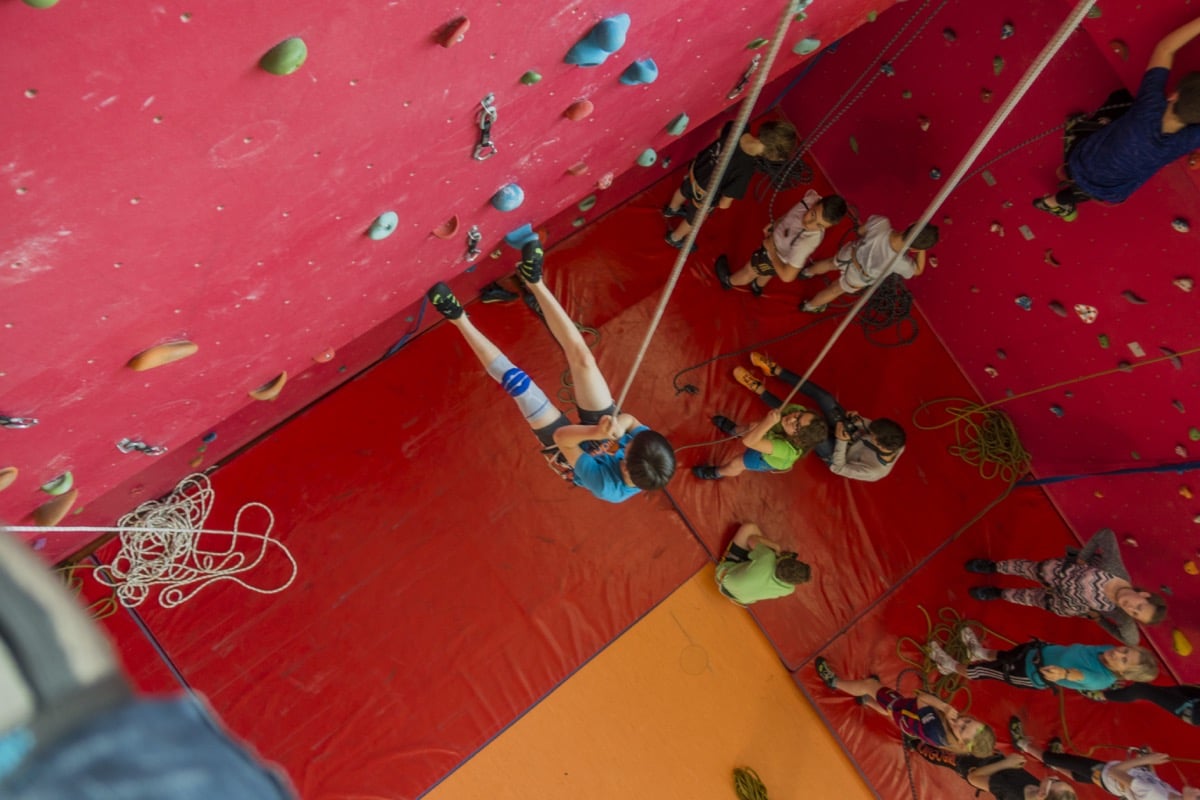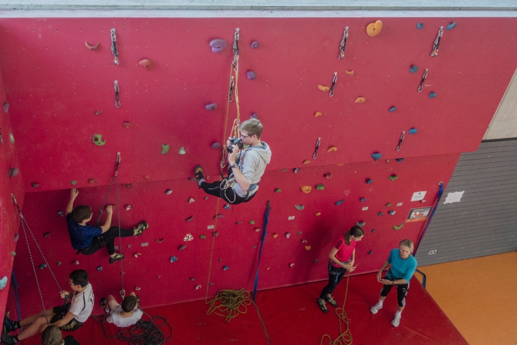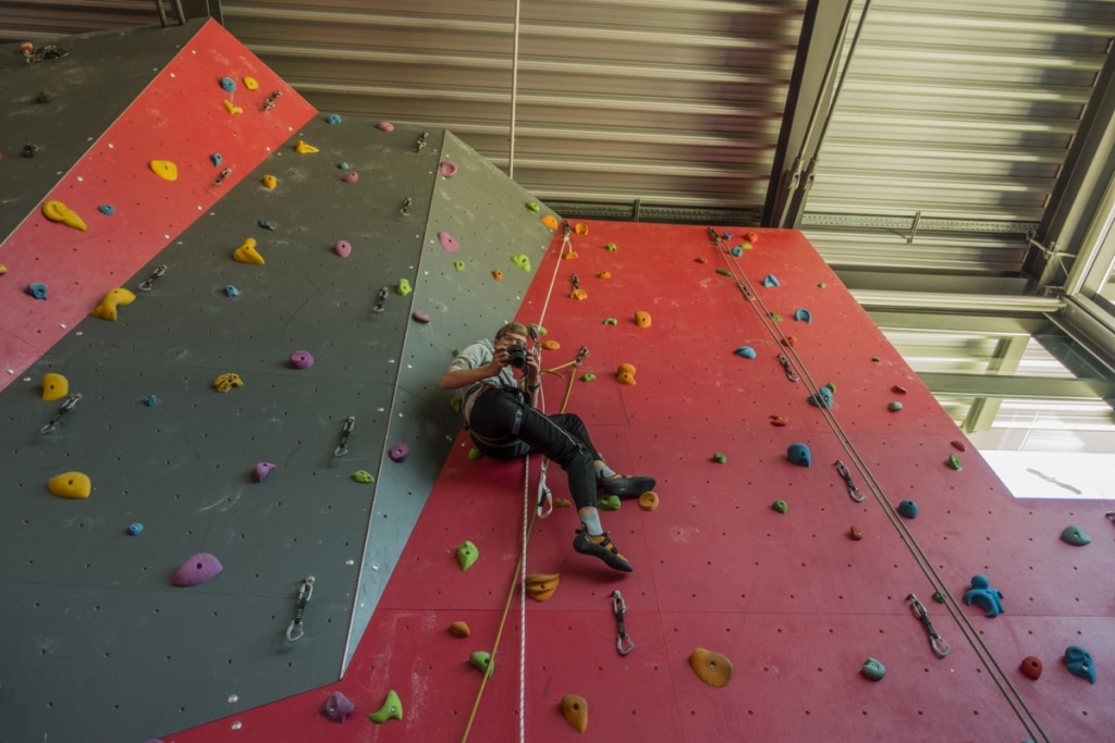 Klettergurt, Schuhe und Sicherungsgeräte können ausgeliehen werden.
